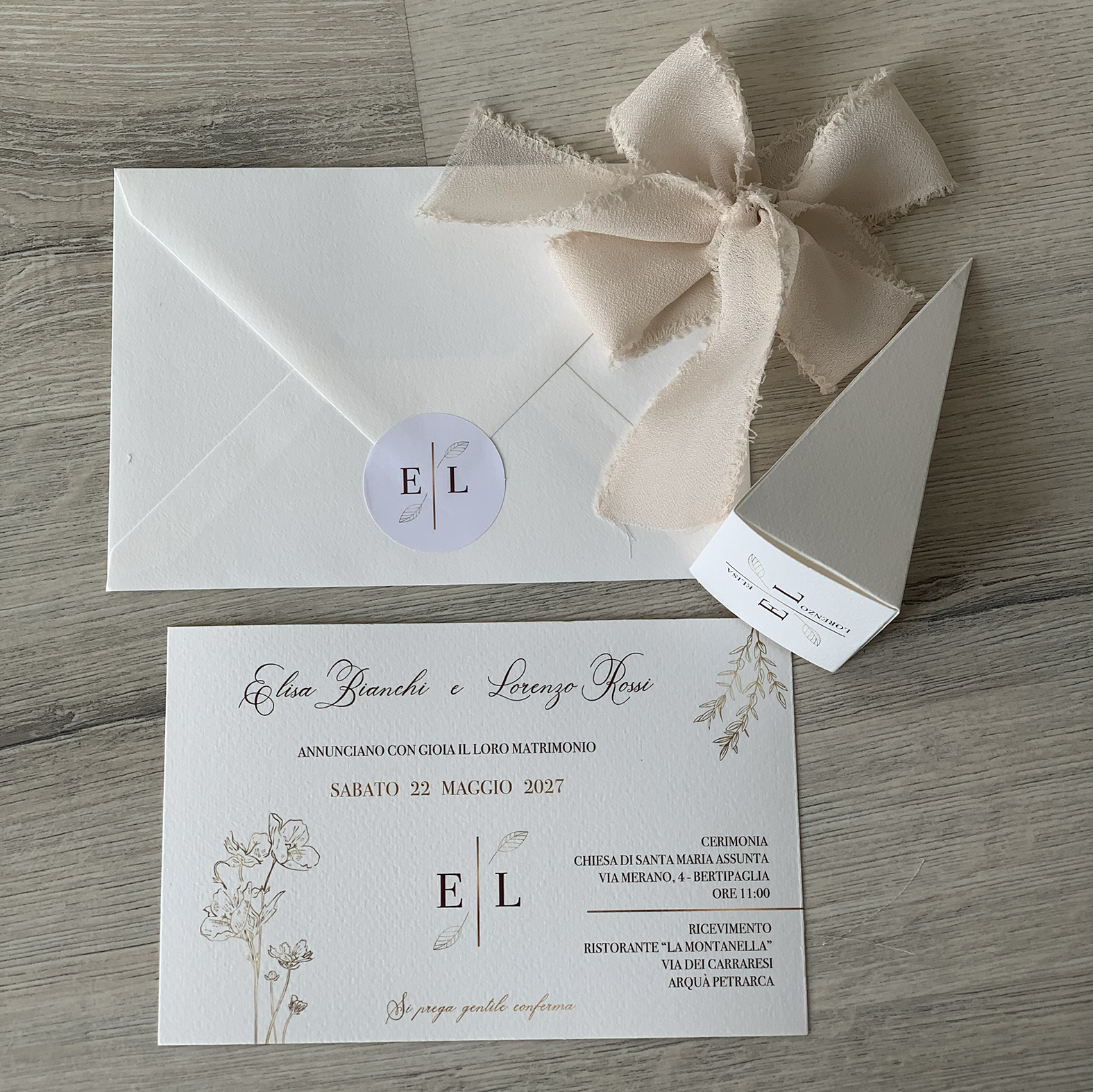| Caratteristiche del materiale: | Semplici ma d'effetto gli inviti nozze realizzati in un unico cartoncino martellato color seta con la stampa di tutti i dati riguardanti il matrimonio daila cerimonia ai festeggiamenti. La busta abbinata e compresa nel prezzo è stata in colore abbinato al cartoncino annuncio. Compresa nel prezzo. Si può abbinare un etichetta adesiva chiudibusta oppure una chiusura con ceralacca ed iniziali. (chiedere preventivo) Con questa grafica si può realizzare un'intera stationery dall'annuncio alla scatolina porta confetti, al tableau de mariage ecc. Stampa sempre compresa - Quantità minima ordinabile 30 pezzi |