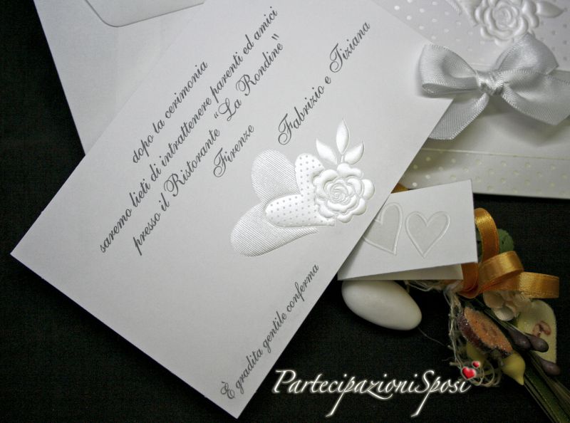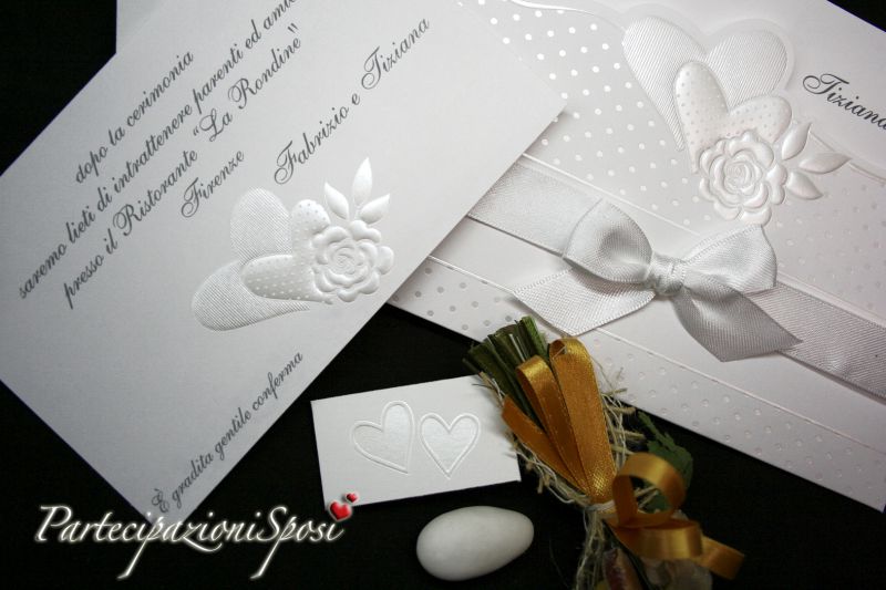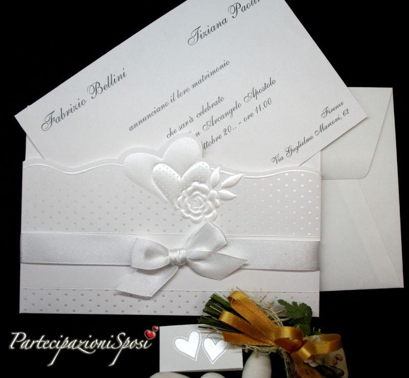 Partecipazioni di nozze formate da custodia in cartoncino bianco liscio con lavorazioni in rilievo e madreperla. Ad impreziosire il tutto viene posto un nastro di raso bianco da 1,5 cm con fiocco centrale.