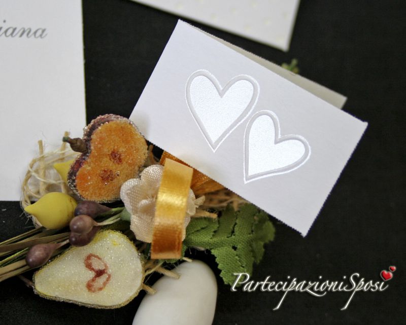 I bigliettini bomboniera sono coordinati in cartoncino bianco con due cuori in rilievo e madreperla.
