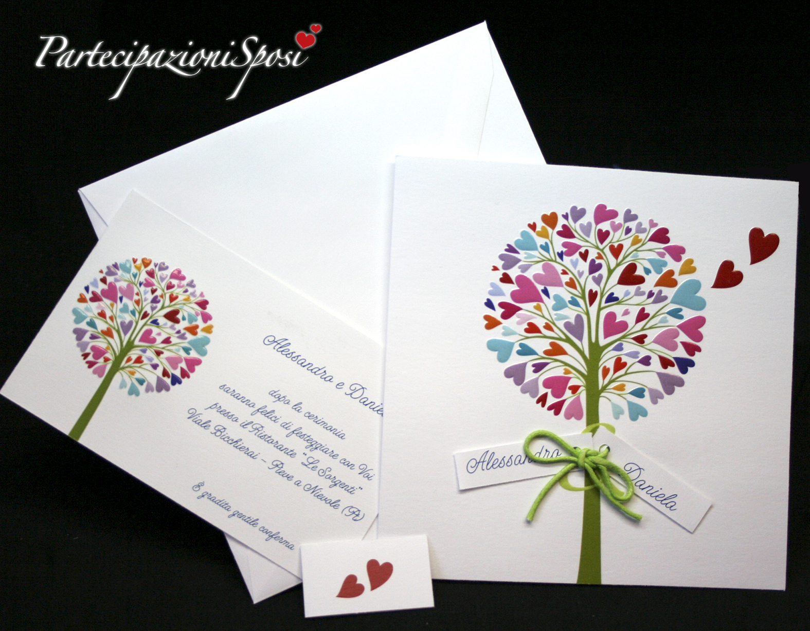 Le partecipazioni o annunci sono in cartoncino bianco con l'albero della vita stampato con particolari in rilievo lucido. Legati con cordoncino verde mela, due cartoncini con stamoati i nomi dei futuri sposi.