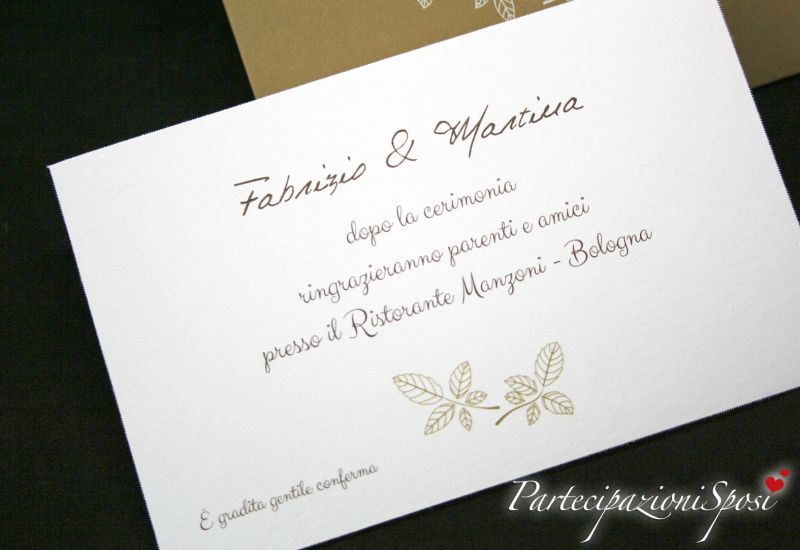 L'invito è realizzato con lo stesso cartoncino bianco dell'annuncio con stampa di foglie sul basso. Nell'invito si stampa il testo per il ricevimento post cerimonia. In questo set l'invito è compreso nel prezzo di ogni partecipazione ordinata. Indicare sempre la quantità degli inviti per poter inserire il testo.