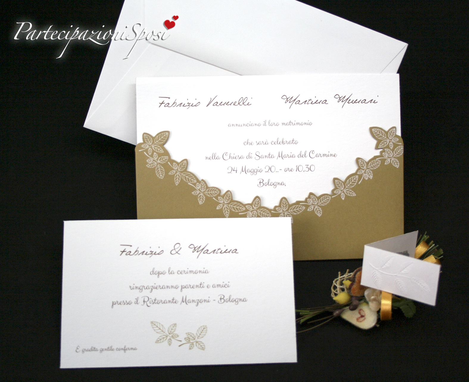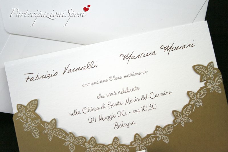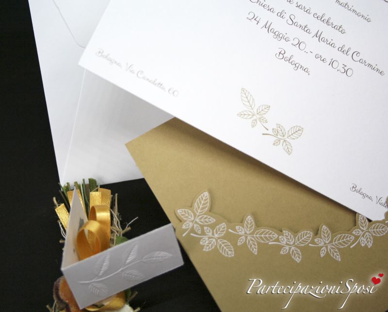 La custodia degli annunci è realizzata in cartoncino Kraft beige intagliato con stampa in bianco di foglie di rosa. L'interno è in cartoncin bianco con stampate nel basso delle foglie in colore beige che richiamano il colore della custodia; in quest'ultimo vengono stampati tutti i dati relativi alla cerimonia: nomi sposi, luogo, data e ora.