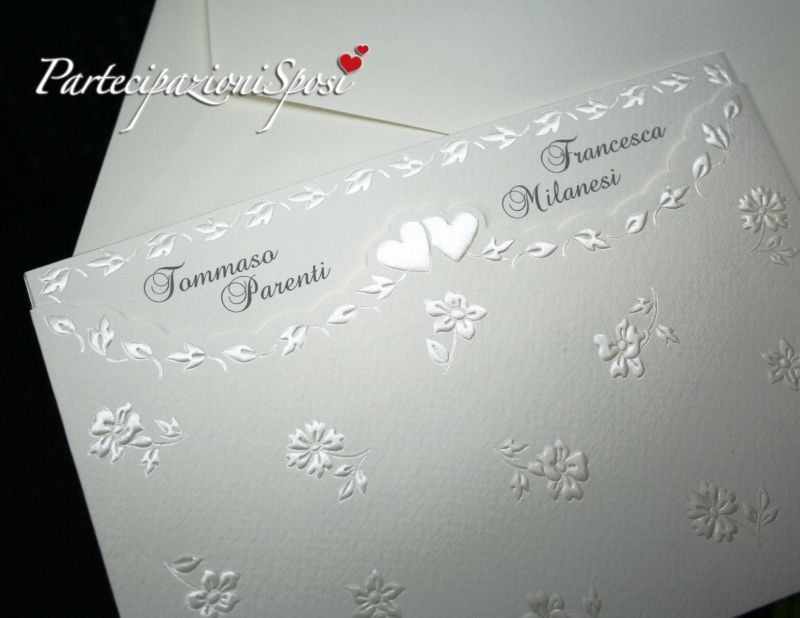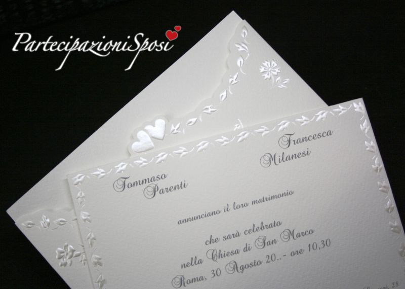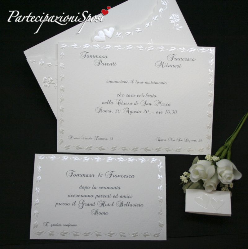 Le partecipazioni sono composte da due elementi. La custodia è realizzata in cartoncino ruvido con nobilitazioni in rilievo e madreperla bianco. L'interno riporta lungo la cornice un motivo di foglie realilzzato in rilievo e madreprla bianco. Su questo cartoncino verranno stampati tutti i dati riguardanti la cerimonia: nomi, data, ora e luogo.