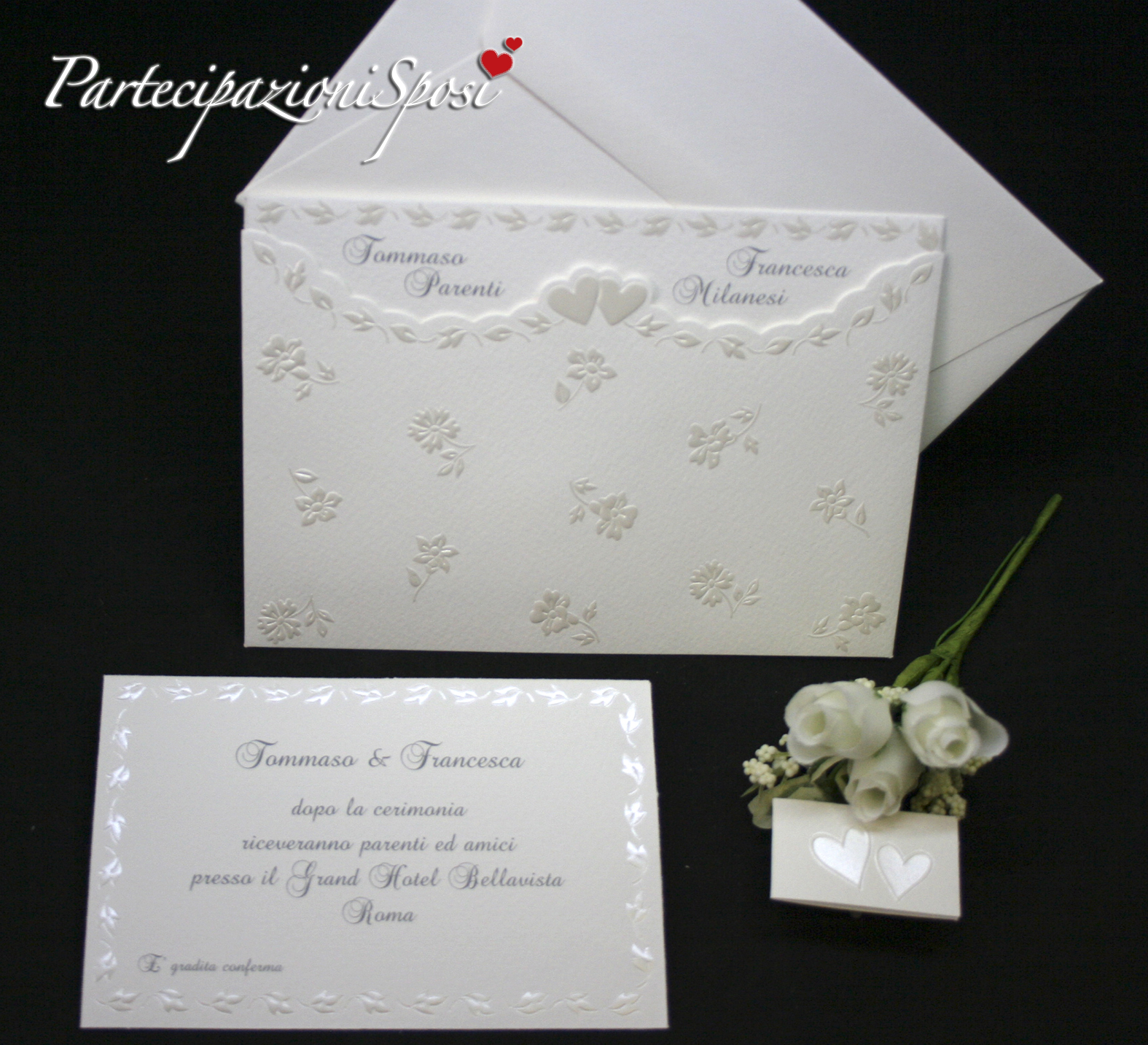 Il cartoncino invito (dove va indicato il luogo dei festeggiamenti post cerimonia) è compreso nel prezzo delle partecipazioni ed è realizzato con lo stesso cartoncino e lavoriazione delle partecipazioni. Indicare sempre la quantità di questi cartoncini per poter inserire il testo e i dati del luogo del ricevimento.