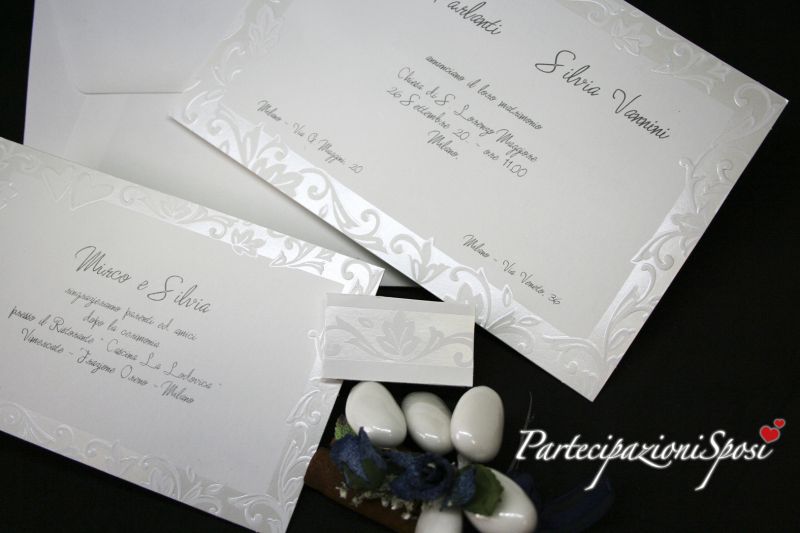 Gli inviti sono realizzati nello stesso cartoncino bianco e con le stesse indentiche lavorazioni, solo in formato più piccolo. Sugli inviti andranno stampati tutti i dati riguardanti i festeggiamenti post cerimonia.