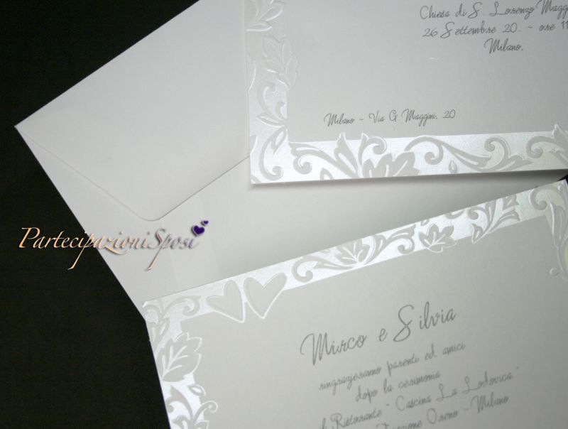 Partecipazioni di nozze realizzate in cartoncino bianco candido con particolari in bianco madreperla lucido e rilievo.
