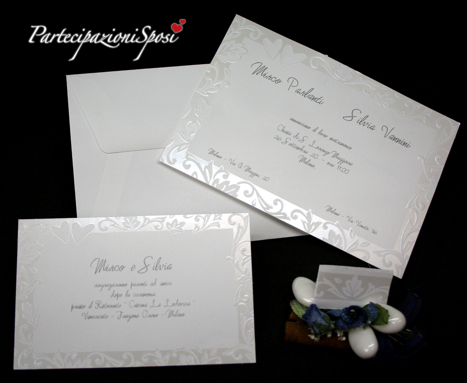 | Caratteristiche del materiale: | Partecipazioni di nozze realizzate in cartoncino bianco candido con particolari in bianco madreperla lucido e rilievo. Il formato è tipo cartolina. Sulle partecipazioni andranno stampati tutti i dati riguardanti la cerimonia: nomi sposi, data, ora e luogo. A discrezione degli sposi i loro indirizzi o l'indirizzo coniugale. Gli inviti sono realizzati nello stesso cartoncino bianco e con le stesse indentiche lavorazioni, solo in formato più piccolo. Sugli inviti andranno stampati tutti i dati riguardanti i festeggiamenti post cerimonia. Della stessa tipologia anche i cartoncini per invitare gli amici o colleghi al taglio della torta oppure per indicare la lista nozze o l'IBAN per un eventuale regalo in denaro. Anche i bigliettini per le bomboniere sono realizzati in cartoncino bianco con il lato frontale arricchito dalla stessa lavorazione degli annunci. Le buste bianche sono comprese nel costo delle partecipazioni. |