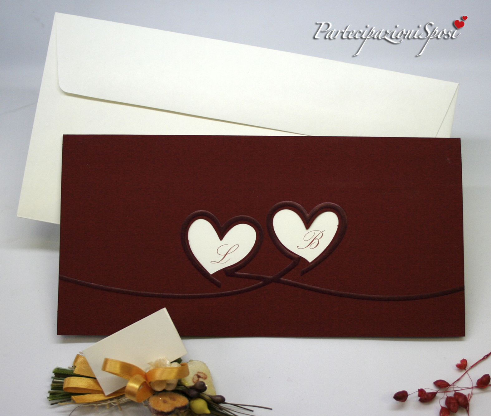 Partecipazioni di nozze a tema colore rosso bordeaux composte da copertina in cartoncino rosso bordeaux effetto soft touch con cuori intagliati e contorni in rilievo lucido tono su tono. L'interno è realizzato in carta avorio sulla quale andranno stampati tutti i dati riguardanti il matrimonio e le iniziali degli sposi che si vedranno quando la partecipazione è chiusa.