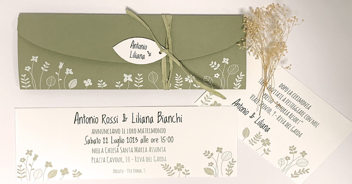 Annunci realizzati in cartoncino bianco con stampa in color verde salvia di fiori e foglie. Gli inviti (compresi nel prezzo delle partecipazioni) sono della stessa tipologia di cartoncino e decori solo in formato più piccolo. Particolarità di questo set è la tasca che contiene sia annuncio che invito; realizzata in cartoncino da 300 gr verde salvia con decori di fiori e foglie realizzata con foile bianco. A chiudere la tasca uno spago in rafia verde salvia e legato insieme un TAG a forma di foglia con stampati i nomi degli sposi.
