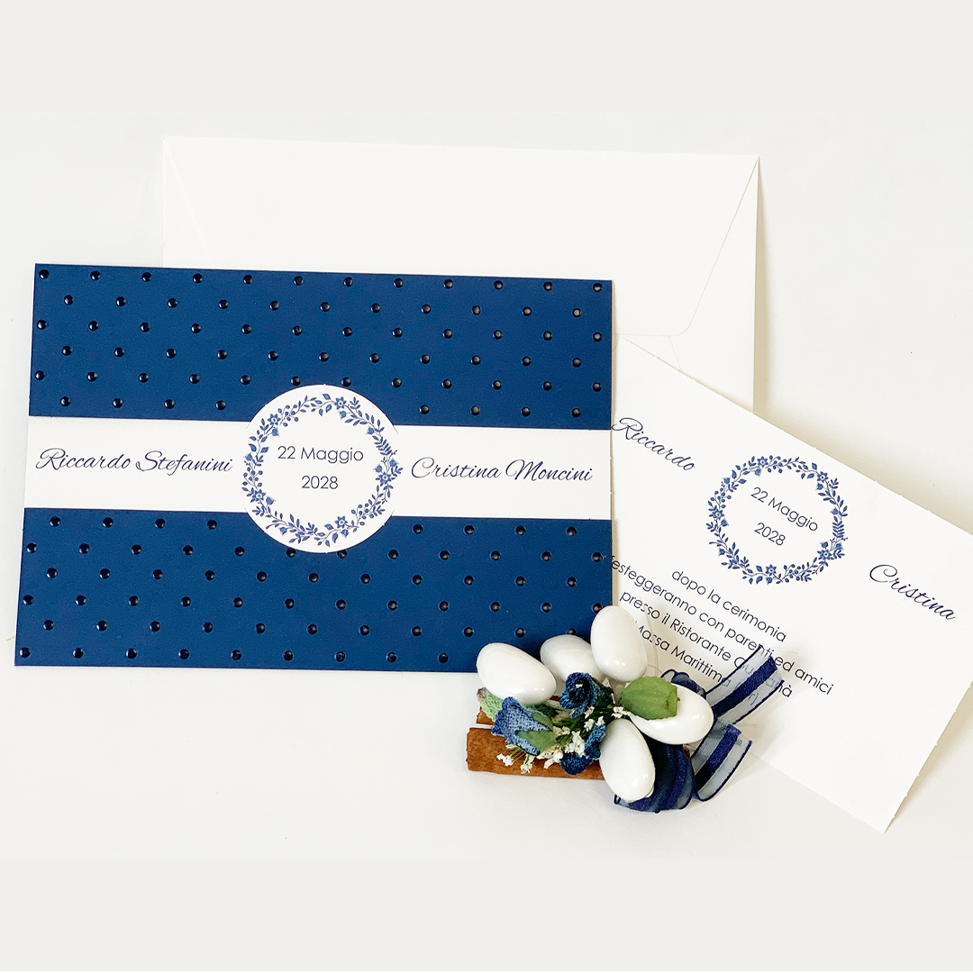 Il set è composto da un custodia in cartoncino blu nobilitato con pallini a pois in rilievo lucido. All'interno va inserito un cartoncino bianco martellato con decoro di ghirlanda blu in rilievo, sul quale vanno stampati tutti i dati riguardanti la cerimonia. Abbinato e compreso nel prezzo un ulteriore cartoncino che può essere utilizzato o per inserire i dati riguardanti il luogo dei festeggiamenti oppure i dati per una eventuale lista nozze o particolari comunicazioni agli invitati.