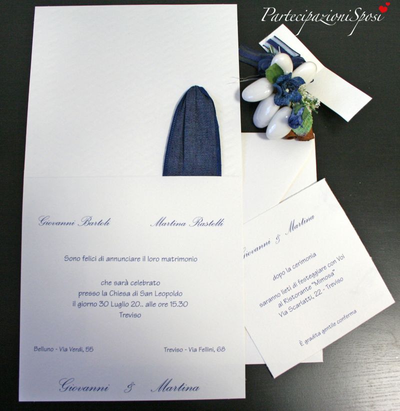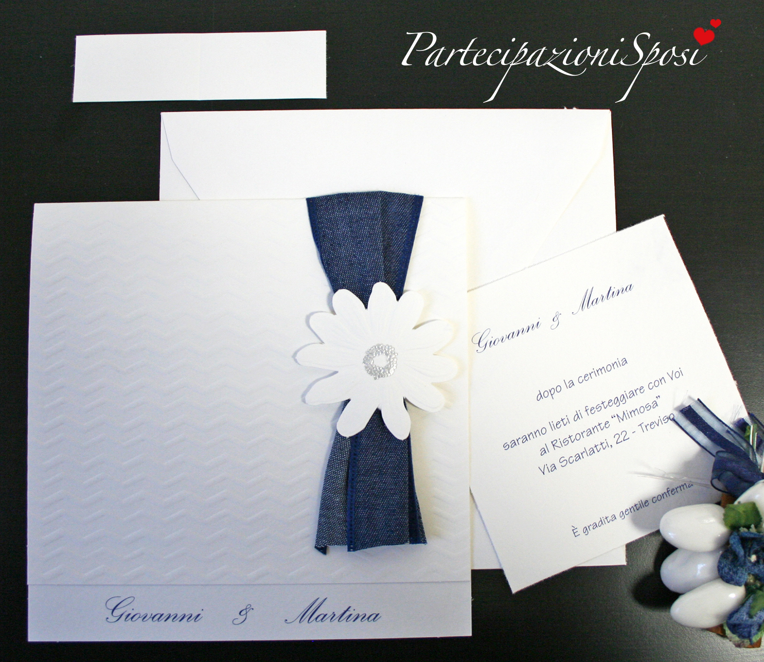 | Caratteristiche del materiale: | Cartoncino ruvido bianco latte con lavorazione a spina di pesce in rilievo. Nastro in tessuto jeans con fiore lavorato in rilievo e argento a caldo. Invito in cartoncino coordinato. Bigliettini bomboniera in cartoncino coordinato. Busta bianca coordinata compresa nel prezzo. Partecipazione da assemblare Non si possono inviare campioni perchè disponiamo solamente di pochi pezzi. |
