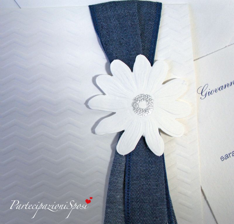 Nastro in tessuto jeans con fiore lavorato in rilievo e argento a caldo.