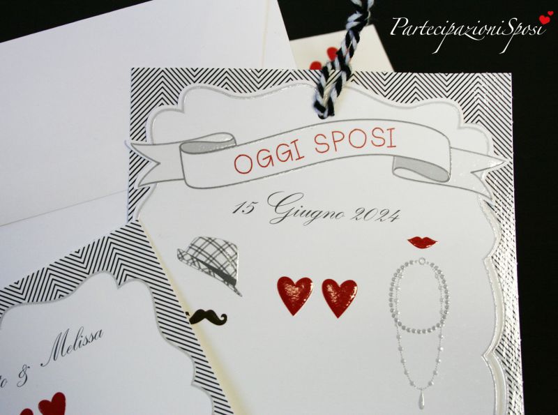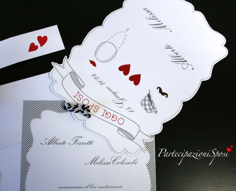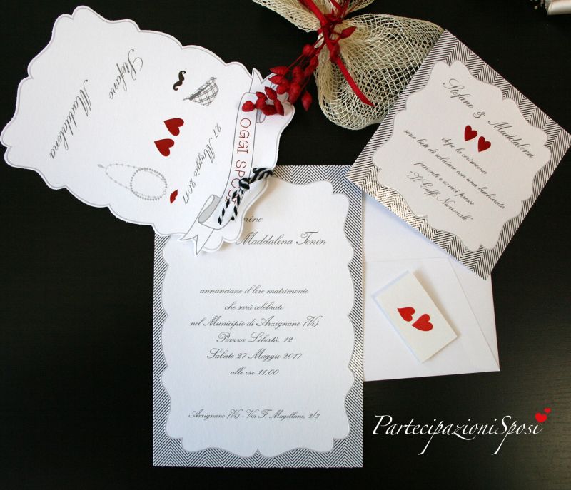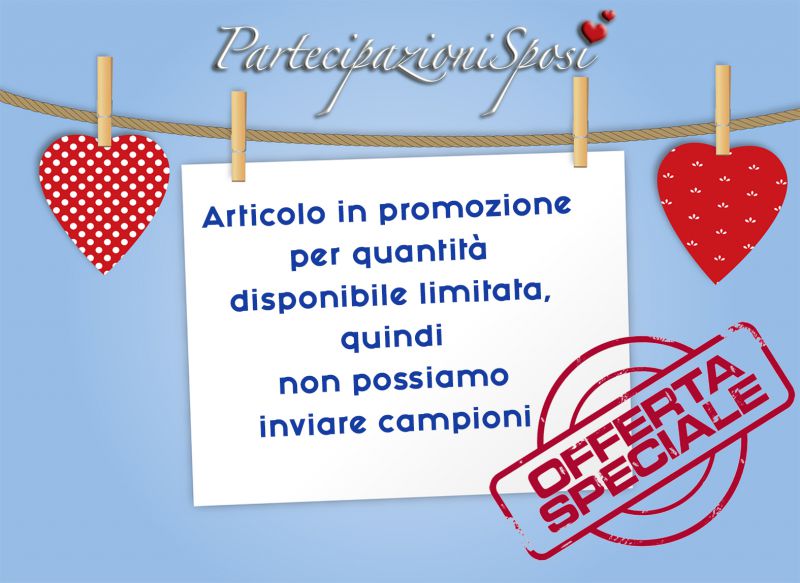 | Caratteristiche del materiale: | Partecipazione composta da una copertina in cartoncino bianco con stampa e lavorazioni in rilievo e verniciatura lucida. Legato con cordoncino bicolore, altro cartoncino con verniciatura lucida, dove esguire la stampa dei dati degli sposi. Invito coordinato con rilievo e verniciatura lucida, compreso nel prezzo. (in caso di ordine indicare la quantità degli annunci e anche degli inviti) Bigliettini per bomboniera coordinato con cuori rossi. Busta coordinata compresa nel prezzo. Partecipazione da assemblare Non si possono inviare campioni perchè disponiamo solamente di pochi pezzi. |