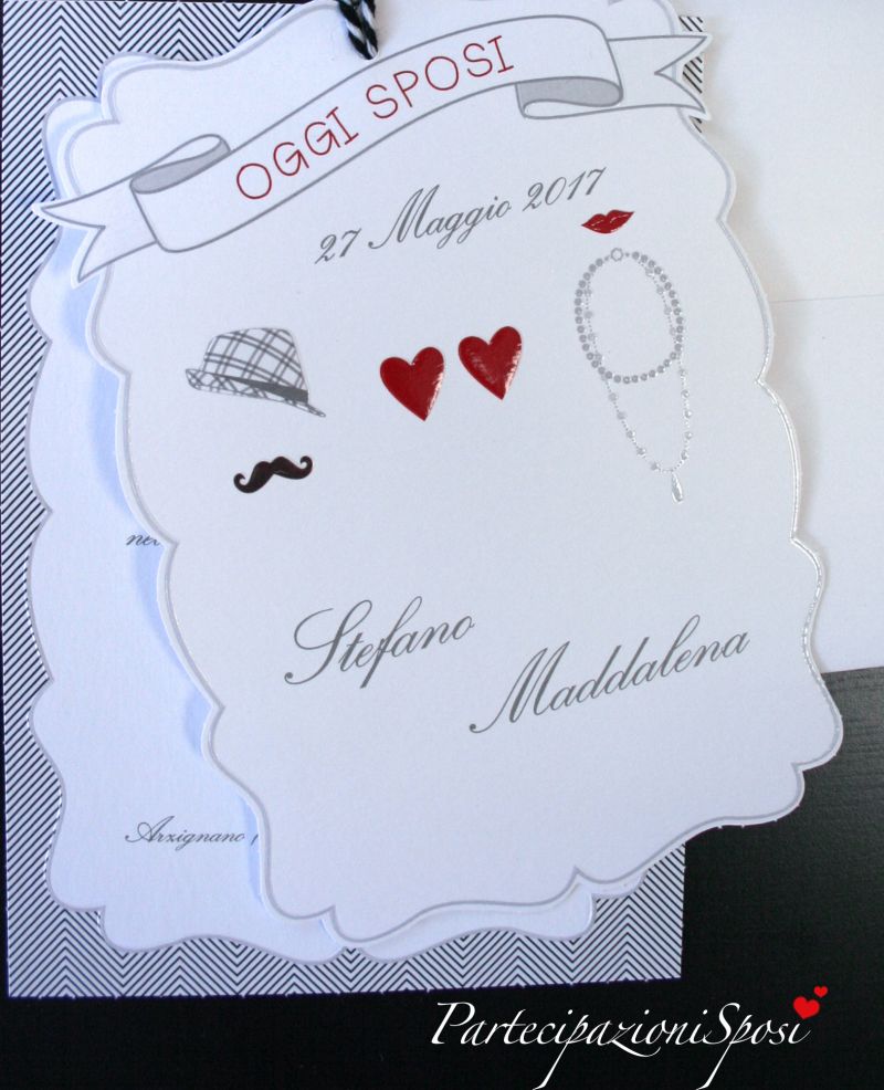 Partecipazione composta da una copertina in cartoncino bianco con stampa e lavorazioni in rilievo e verniciatura lucida.