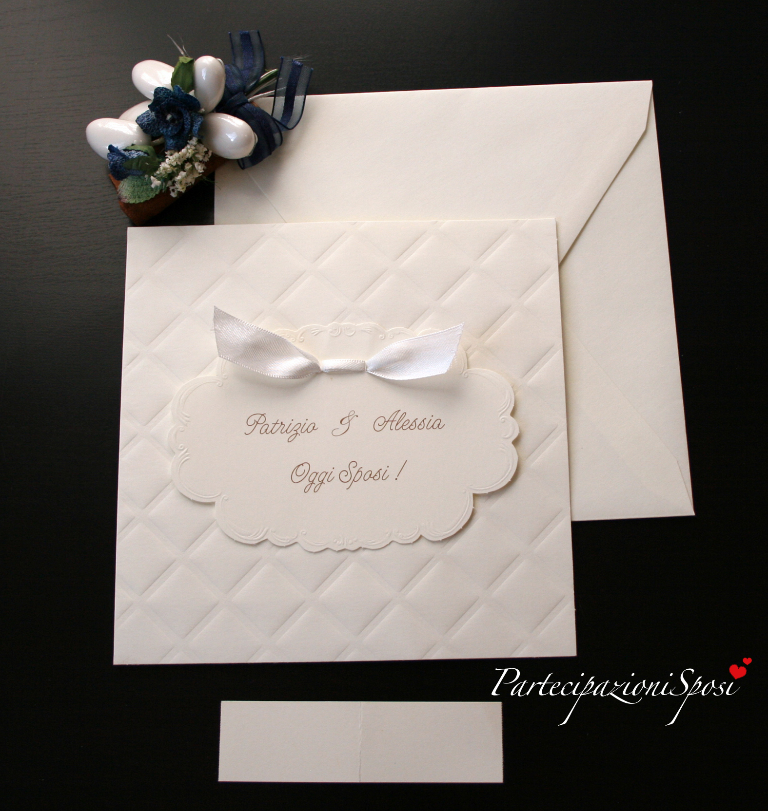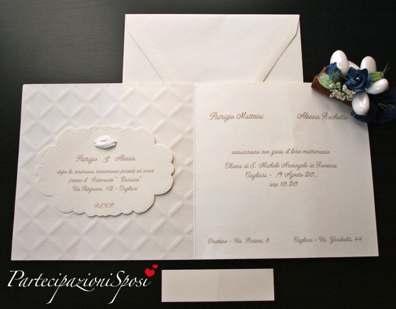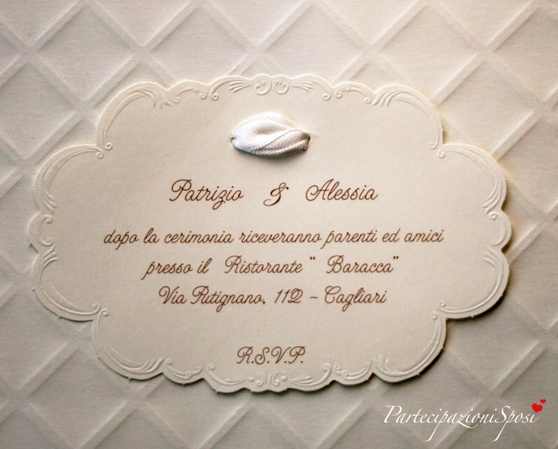 Invito e talloncino con nomi fustellati e decorati con rilievo.