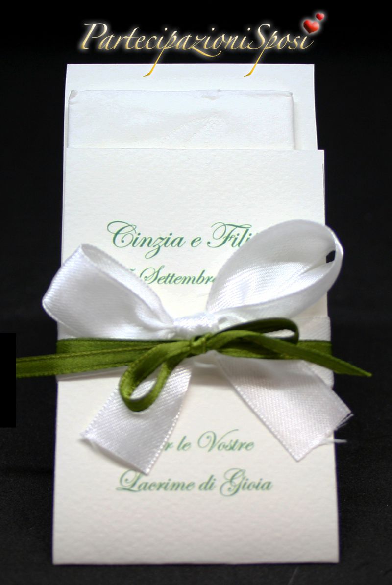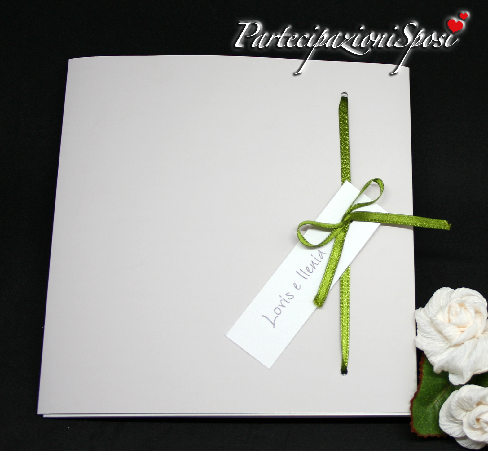 | Caratteristiche del materiale: | Copertina in cartoncino grigio perla soft touch. Nastro in raso su cui legare cartoncino con nomi. Interno con carta bianca su cui stampare il testo (consigliato marrone o nero o blu). Rilegatura con punto metallico. Libretto da assemblare. Nel caso di interessamento richiedere preventivo. Per il testo interno si accetta file in Word. Inviare tramite mail separatamente anche eventuali immagini a: info@partecipazionisposi.it Quantita' minima ordinabile pezzi 30. |
