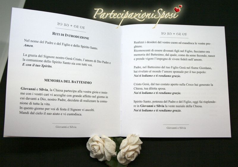 | Caratteristiche del materiale: | Elegnante libretto per cerimonia civile o messale con copertina in cartoncino millerighe bianco candido. Stampa copertina a un colore a scelta. (disegni e decori da scegliere in base alle vostre richieste) Interno con carta bianca liscia e stampa a un colore (consigliato marrone o nero o blu). Rilegatura con punto metallico e nastro di raso bianco alto 1 cm che imprezisce il libretto. Per il testo interno si accetta file in Word. Inviare tramite mail separatamente anche eventuali immagini a: info@partecipazionisposi.it Quantita' minima ordinabile pezzi 30. |