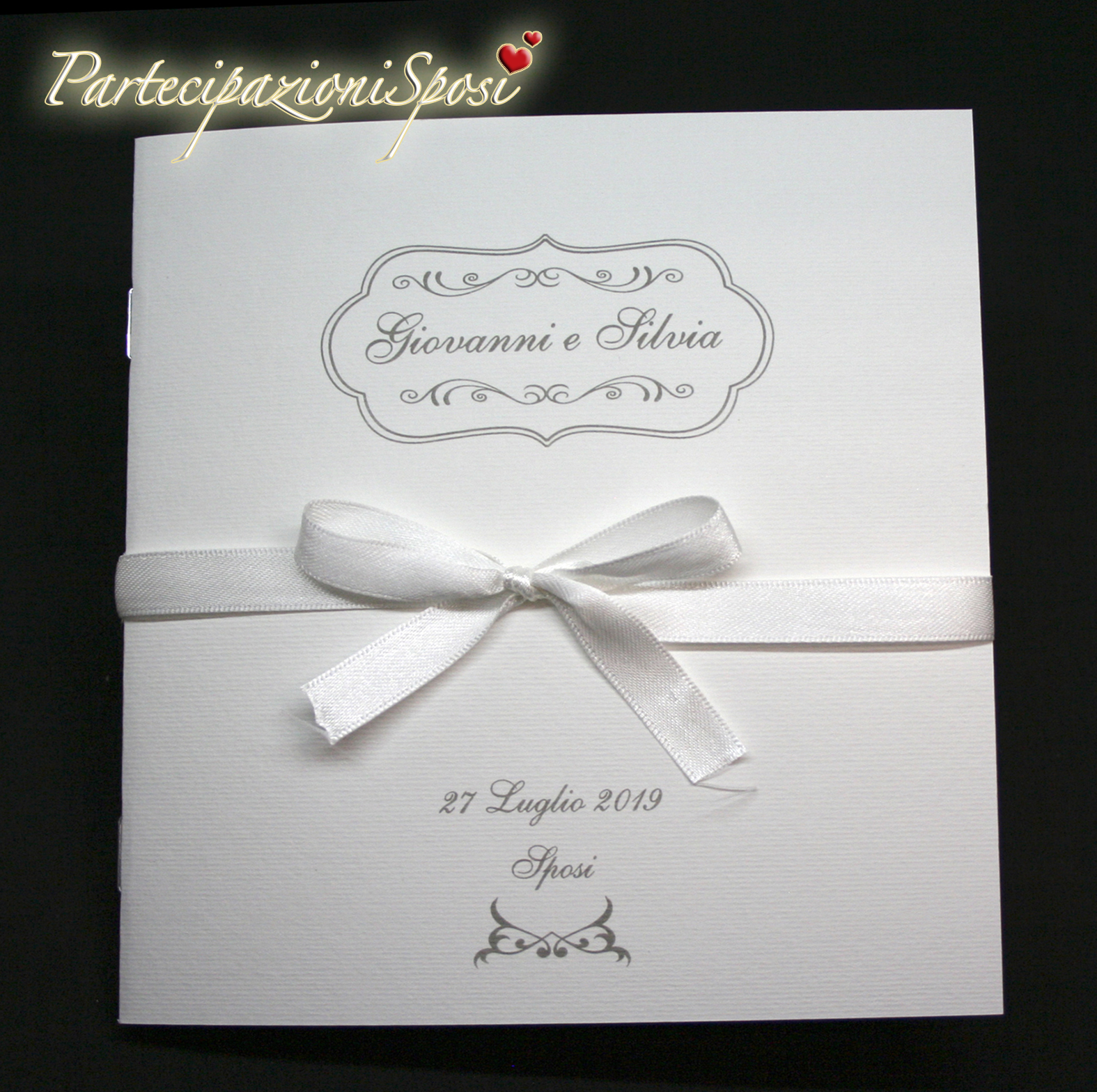 Rilegatura con punto metallico e nastro di raso bianco alto 1 cm che imprezisce il libretto.