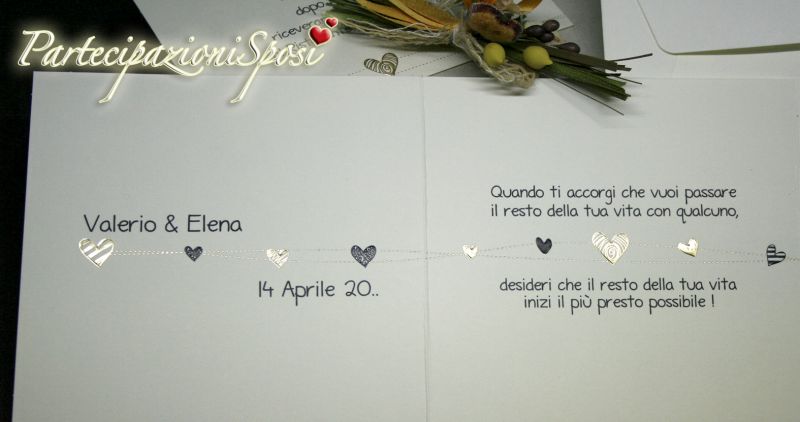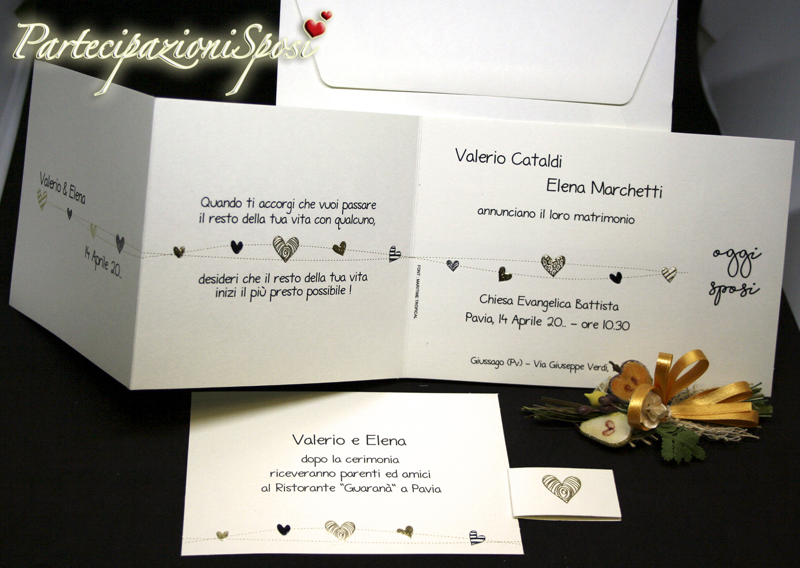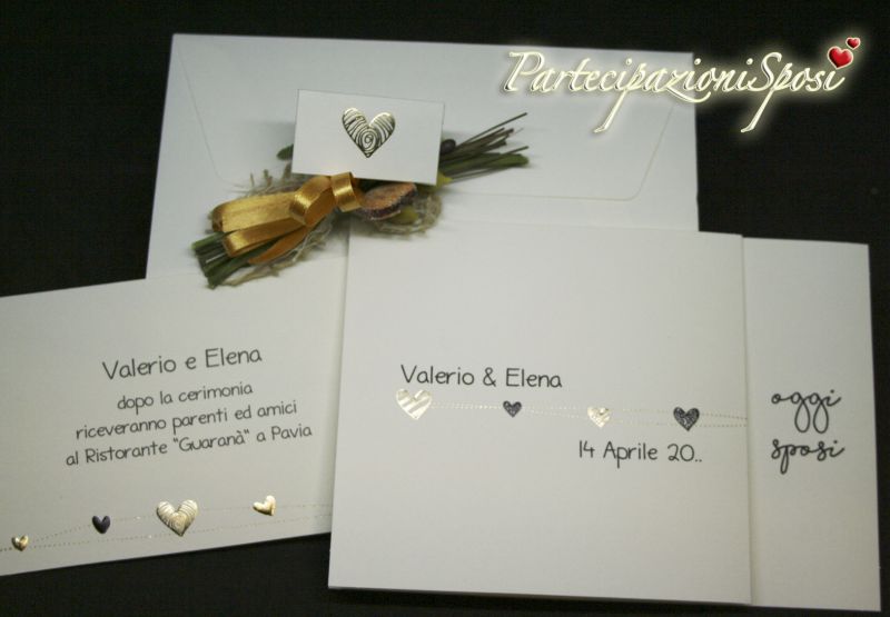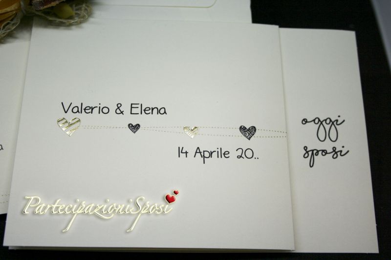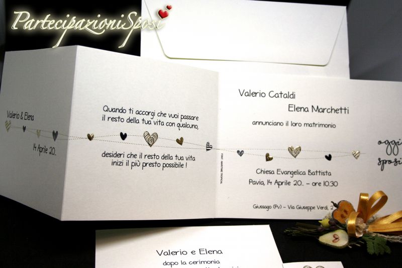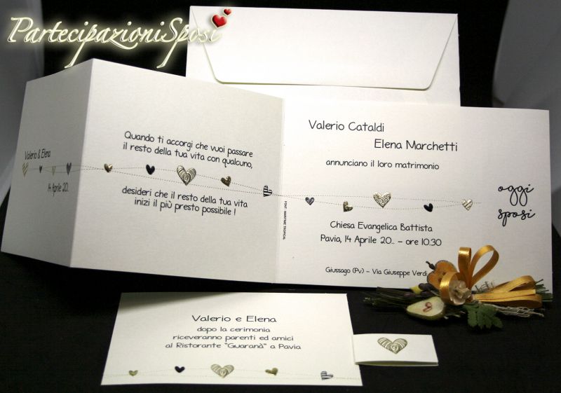 La partecipazione di nozze è in cartoncino pesante di color crema arricchita da lavorazioni in oro lucido e nero opaco in rilievo. E' composta da tre sezioni: una con i nomi e la data, una con una frase da inserire che può essere un passo del Vangelo come una frase tratta da qualche libro o anche da una canzone a voi particolarmente cara; la terza parte contiene tutti i dati su dove si svolgerà la cerimonia.