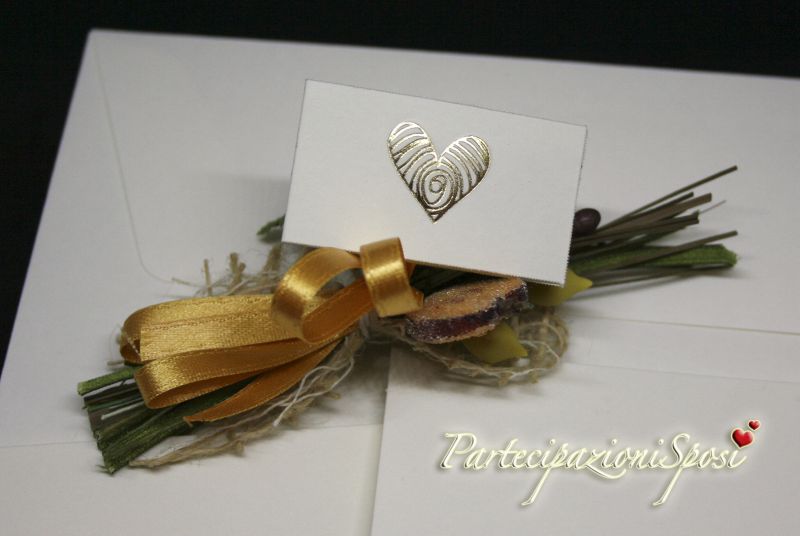 I bigliettini bomboniera sono coordinati inin cartoncino avorio con cuore stilizzato in oro a caldo e rilievo.
