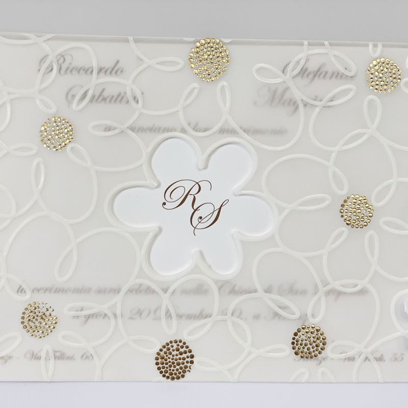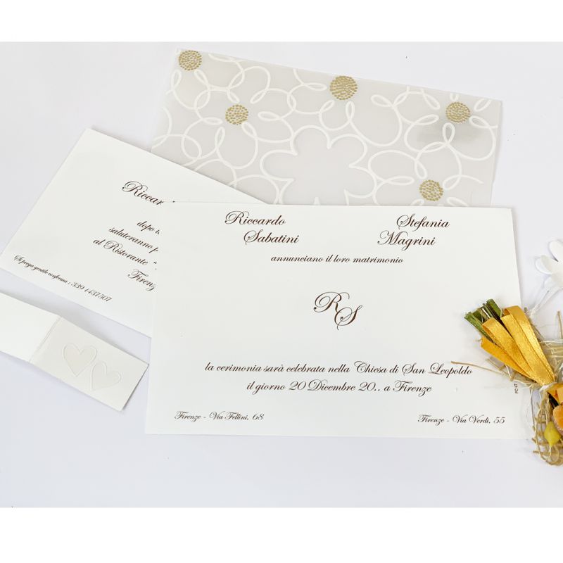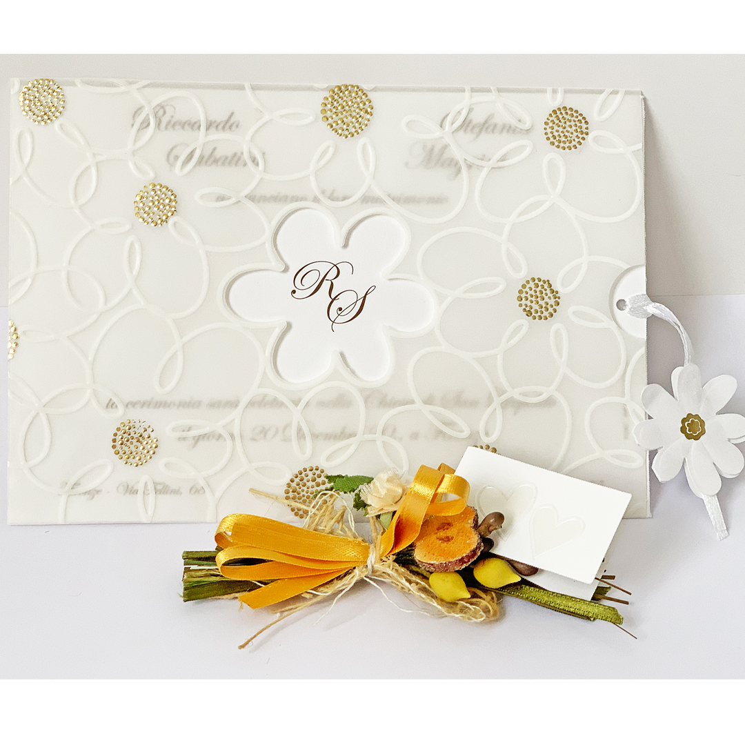 L'annuncio è composto da una tasca trasparente con stampate a in oro e bianco a caldo e in rilievo, delle margherite. Al centro è intagliata una sagoma di margherita dalla quale si vedono le iniziali degli sposi stampate sul cartoncino bianco inserito all'interno della tasca. Un tag a forma di margherita, legato al cartoncino dell'annuncio permette di estrarlo comodamente dalla tasca.