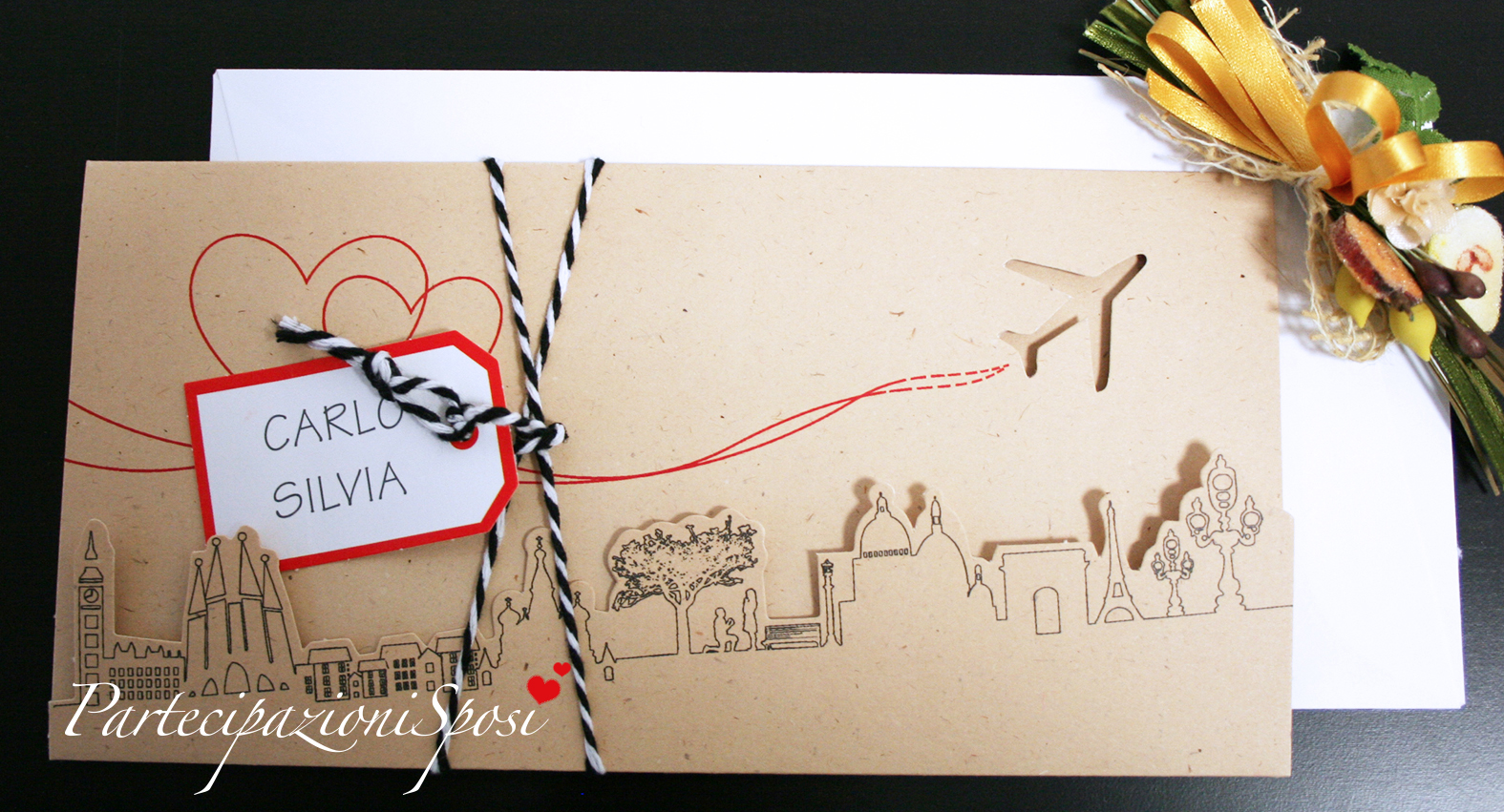 | Caratteristiche del materiale: | Annuncio composto da cartoncino con stampa biglietto aereo. Invito uguale all'annuncio e compreso nel prezzo. In caso di ordine specificare sempre la quantità degli annunci e degli inviti così si possono inserire i dati per entrambi. Ad ogni partecipazione corrisponde 1 biglietto invito. Per la lista nozze o IBAN verrà stampato un cartoncino aggiuntivo. Copertina in cartoncino beige melange con stampa e particolari intagliati. Legato con cordoncino bianco e nero etichettina con i nomi degli sposi. Bigliettino bomboniera coordinato. Busta bianca comprea nel prezzo. Partecipazione da assemblare |