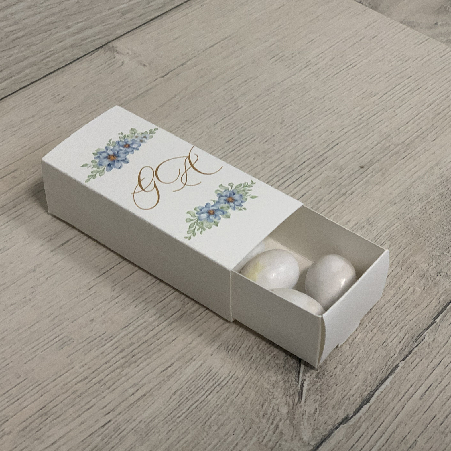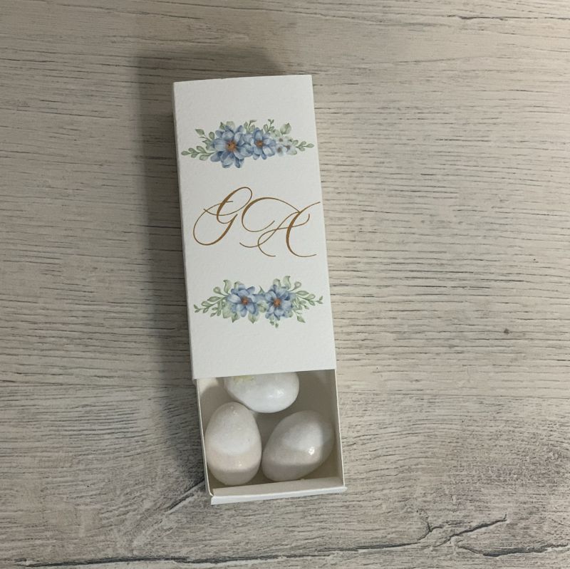 | Caratteristiche del materiale: | Scatoline a fiammifero automontanti. Realizzate in cartoncino pregiato ruvido o liscio. Stampa di grafiche personalizzate. Misure cm 8x4x2,5 |