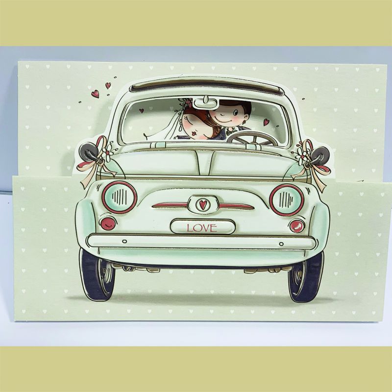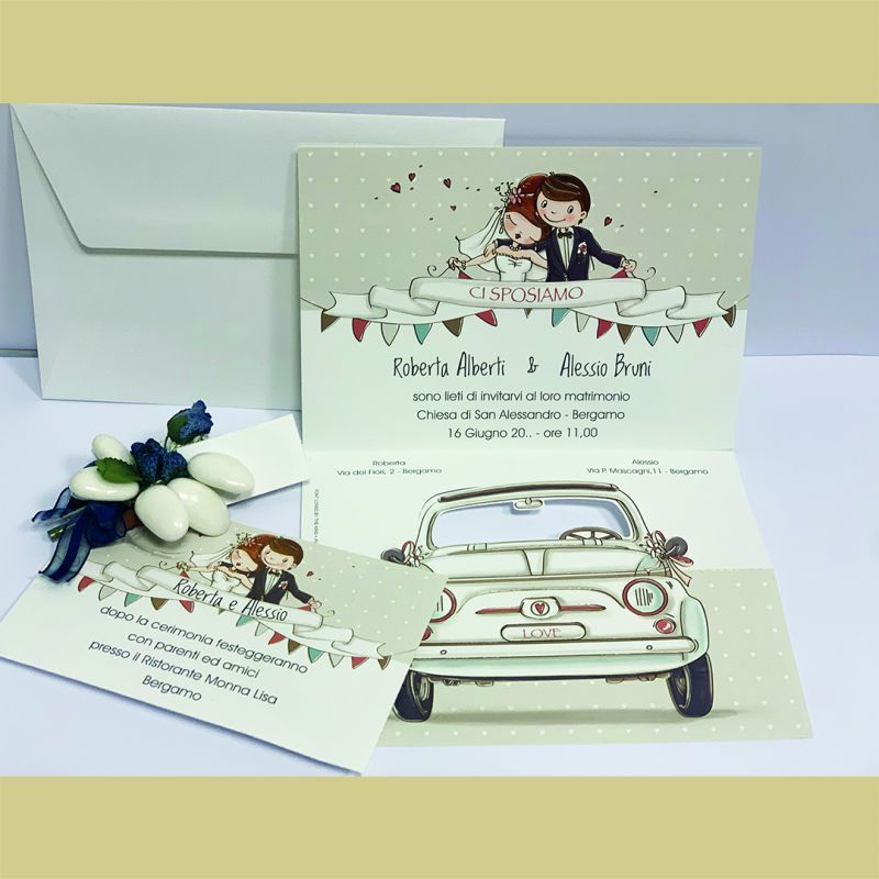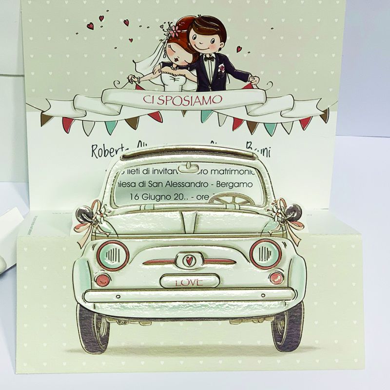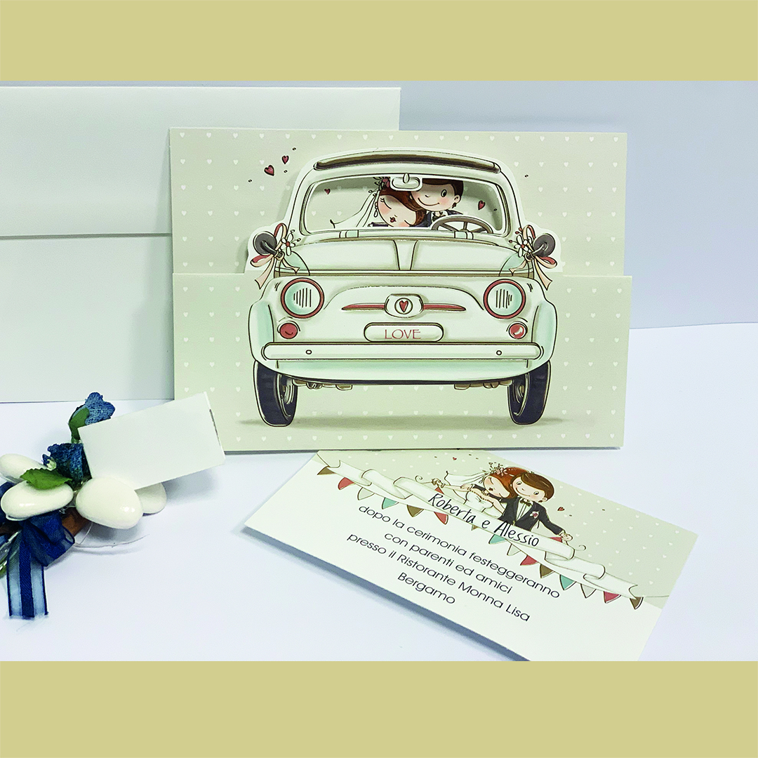 Inviti nozze simpatici con auto "500 d'epoca" da sfondo.