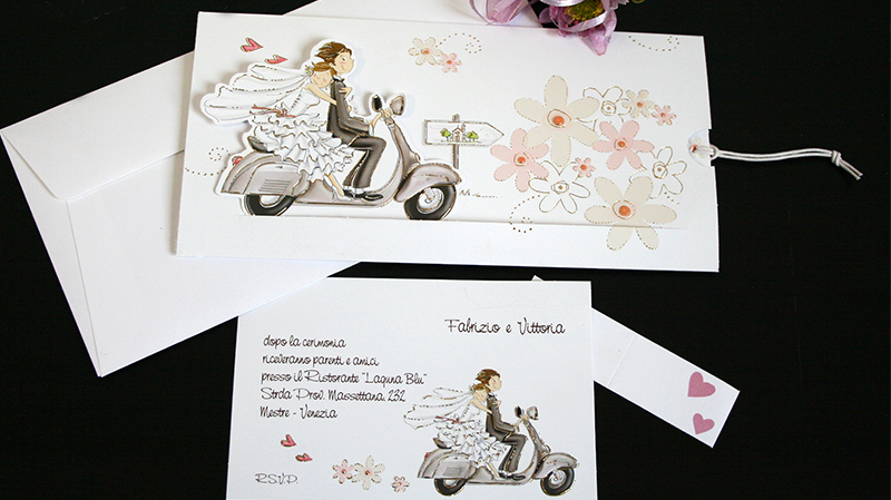 Gli inviti spiritosi possono essere realizzati utilizzando immagini divertenti degli sposi in bicicletta, a bordo della mitica vespa o su di un furgoncino vintage. Ma anche caricature, pop-up e dettagli in rilievo aiutano a dare un tocco dinamico all’invito e possono richiamare il vostro stile.